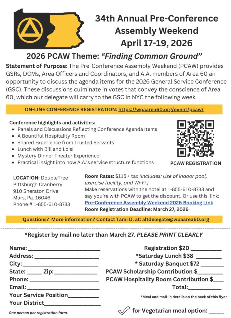 Discover upcoming AA events in Area 60 (Western Pennsylvania) designed to support your path to sobriety and connection.